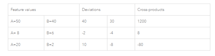 The tool computes the mean and variance for the attribute being evaluated. Then, for each feature value, it subtracts the mean, creating a deviation from the mean. Deviation values for all neighboring features (features within the specified distance band, for example) are multiplied together to create a cross-product. Notice that the numerator for the Global Moran’s I statistic includes these summed cross-products. Suppose features A and B are neighbors, and the mean for all feature values is 10. Notice the range of possible cross-product results: