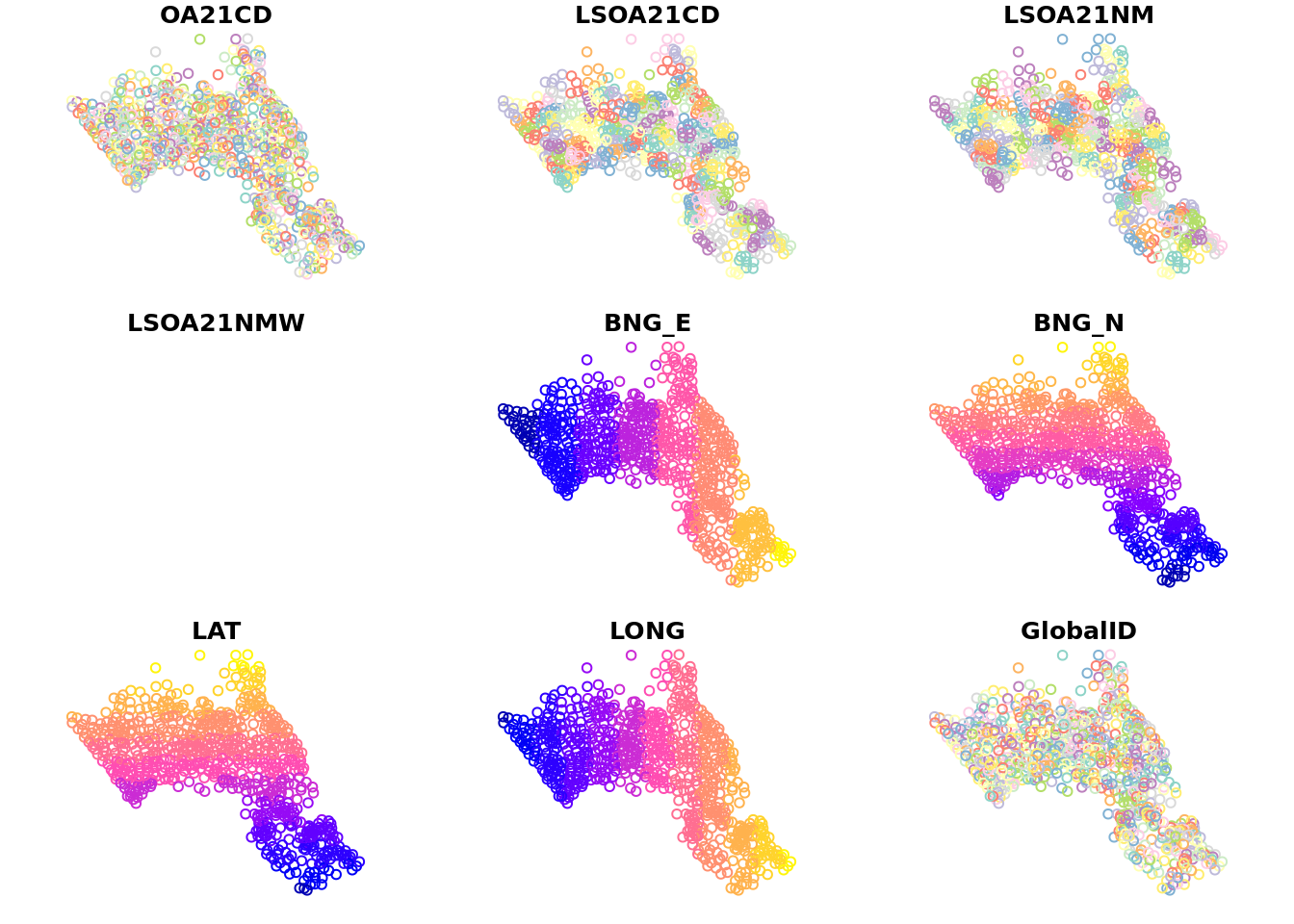 Given that the adjacency (as in the Rook or Queen’s case) hasn’t been sufficient to reach the threshold of 8 we can look to a distance based approach. In the code below we say that any areas that are within 2.5km (2500m) of one another are considered neighbours.