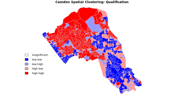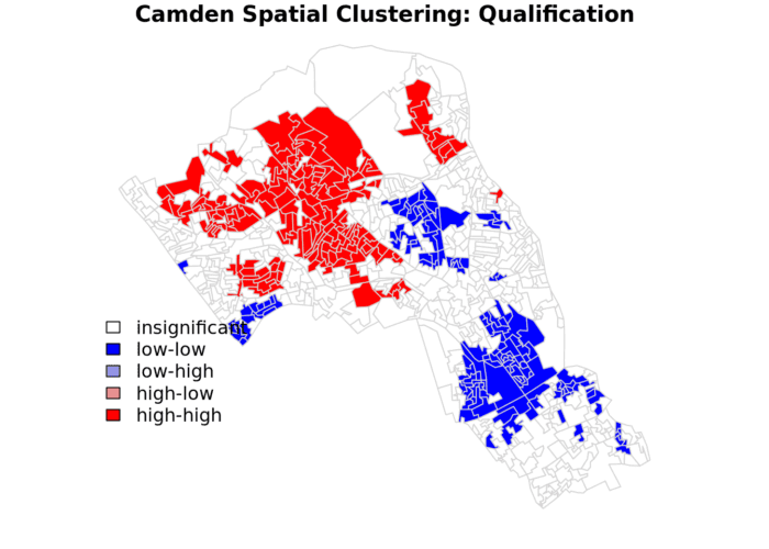 The resulting map reveals that it is apparent that there is a statistically significant geographic pattern to the clustering of our qualification variable in Camden.
