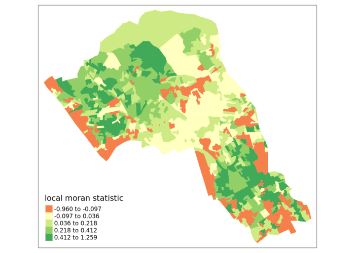 Conceptually this is slightly different from local Moran’s I. As Livings and Wu (2020) explain: