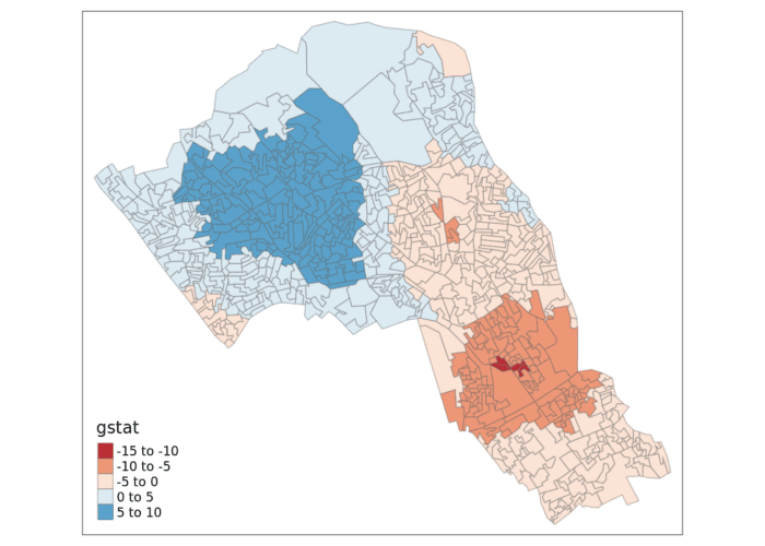 Another approach we can take is hot-spot analysis. The Getis-Ord Gi Statistic looks at neighbours within a defined proximity to identify where either high or low values cluster spatially. Here statistically significant hot spots are recognised as areas of high values where other areas within a neighbourhood range also share high values too.