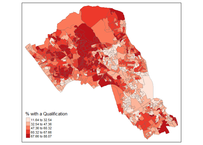 tm_shape(OA.Census) + tm_fill("Qualification", palette = "Reds", style = "quantile", title = "% with a Qualification") + tm_borders(alpha=.4)