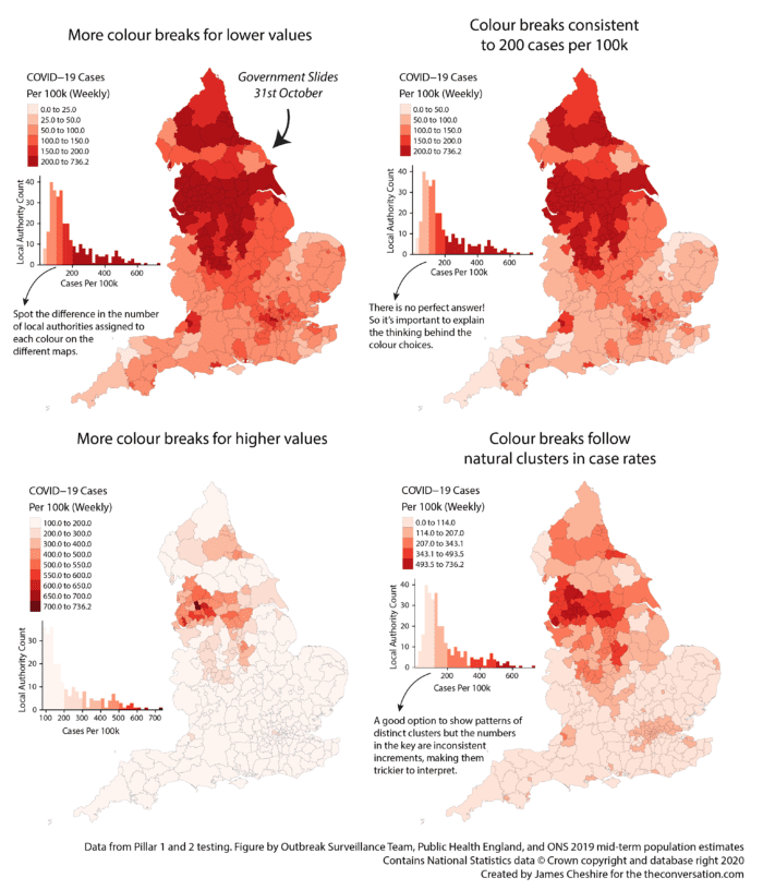 To learn more about each of the styles of colour breaks we are using see here (this is a preview of some of the content we cover in my third year Cartography and Data Visualisation module).