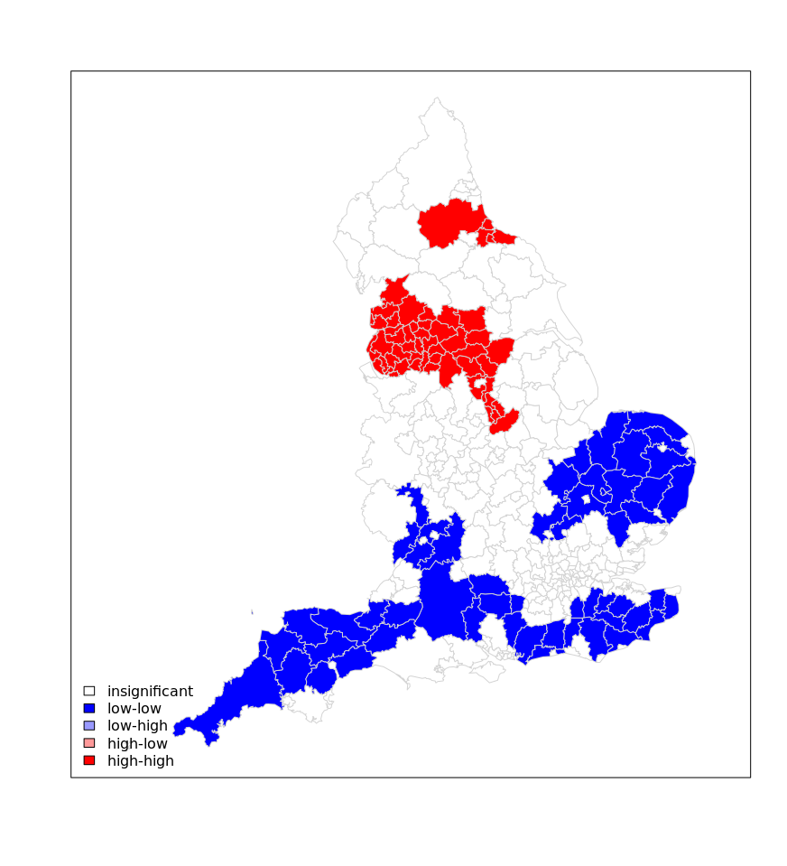 From the above map it clear that the North West and South West exhibit high Moran’s I values, suggesting some spatial autocorrelation in the COVID-19 rates.