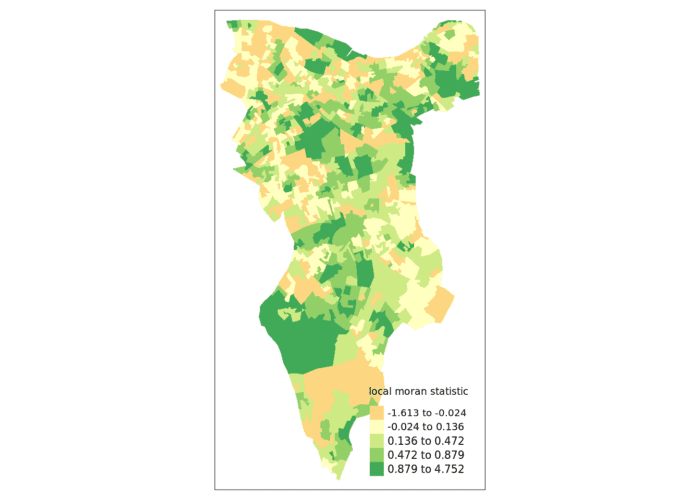 From the map it is possible to see the variations in autocorrelation across space. We can interpret that there seems to be a geographic pattern to the autocorrelation. However, it is not possible to understand if these are clusters of high or low values.