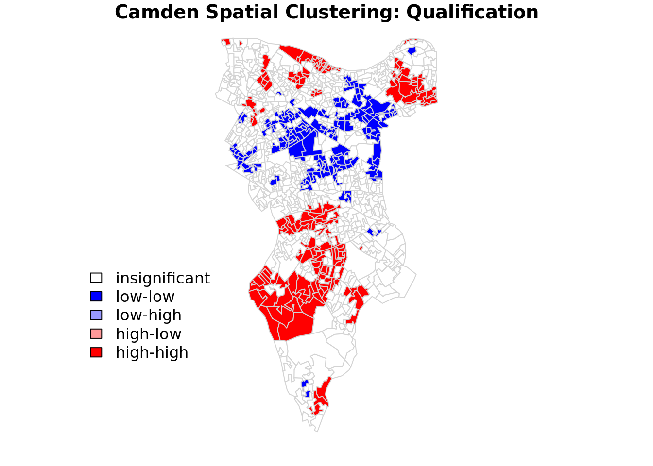 The moran I statistic is 0.59, we can therefore determine that there our qualification variable is positively autocorrelated in Southwark. In other words, the data does spatially cluster. We can also consider the p-value to consider the statistical significance of the model.