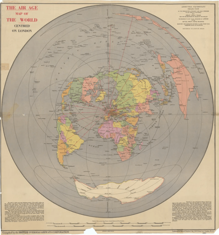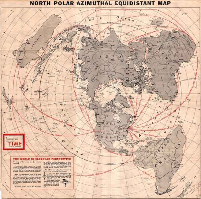 The projection became widely used in the 1940s and 1950s (and was indeed adopted for the UN flag in 1946) because it proved effective at demonstrating the wonder of the burgeoning “air age” as commercial flights followed great circle routes over the Arctic.